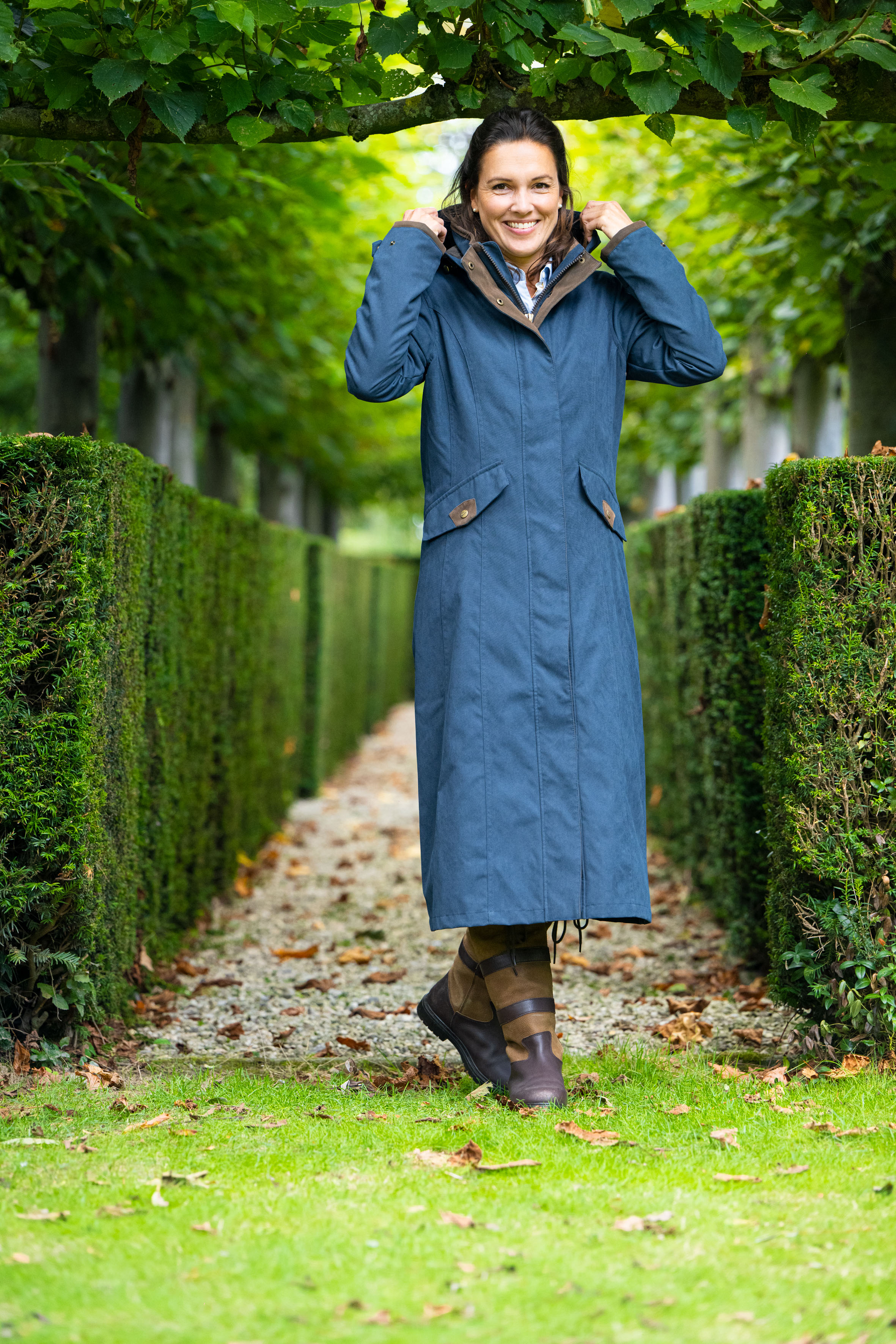 This practical yet stylish ladies long coat is both waterproof and breathable. The style is influenced by the classic outback drovers coat and is manufactured in a tough and durable fabric. Ladies will love the elegant feminine fit of this coat. This might be the best long raincoat you can get for dog walking, horse riding, shooting and other countryside pursuits. For extra protection against the elements, the Kensington features a detachable adjustable hood and a pommel flap. Our interactive Sally/Sarah fleeces can be zipped in for extra warmth on cold days. The coat flatters and flows as you move. Back length: 120 cm.