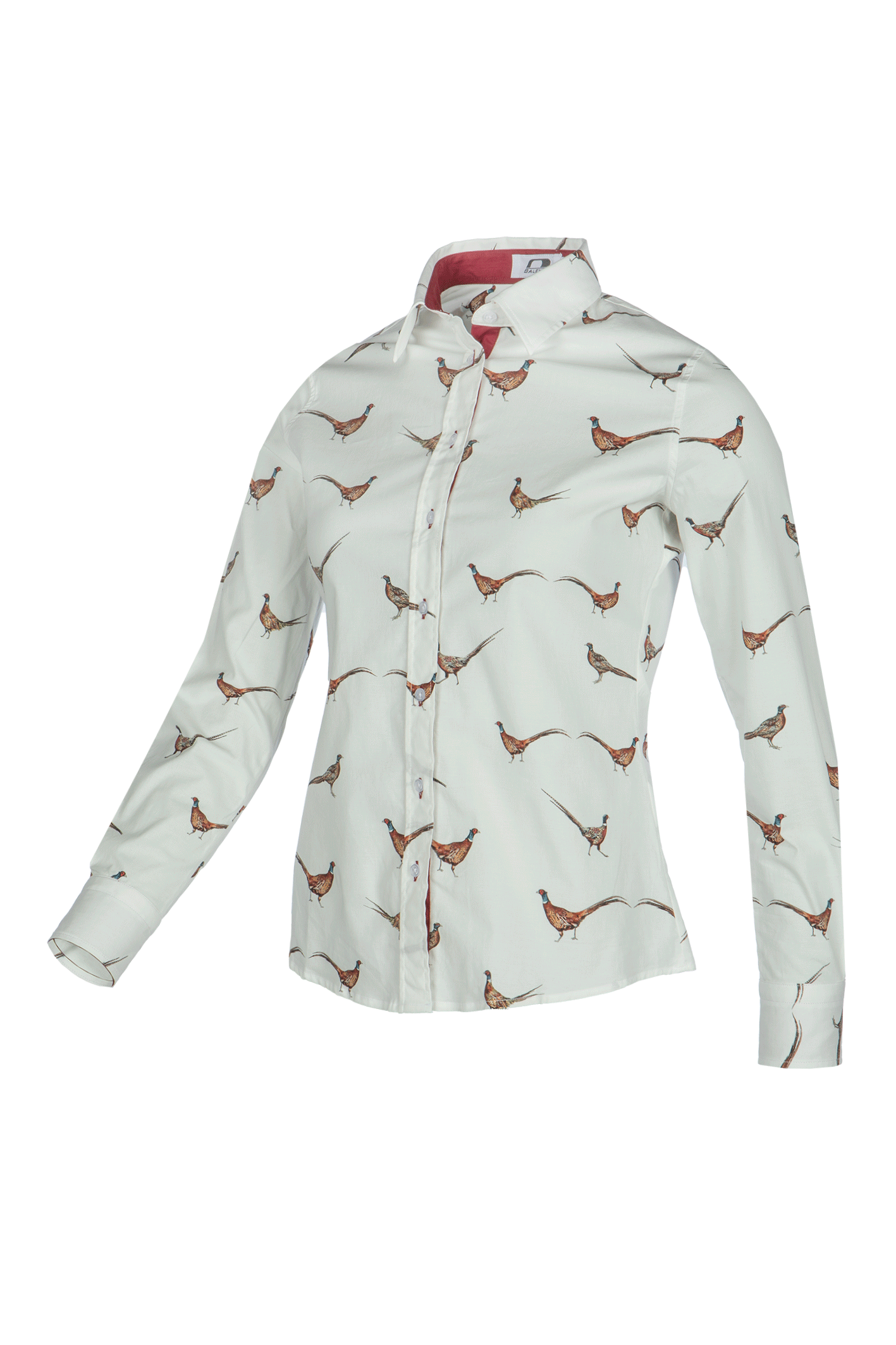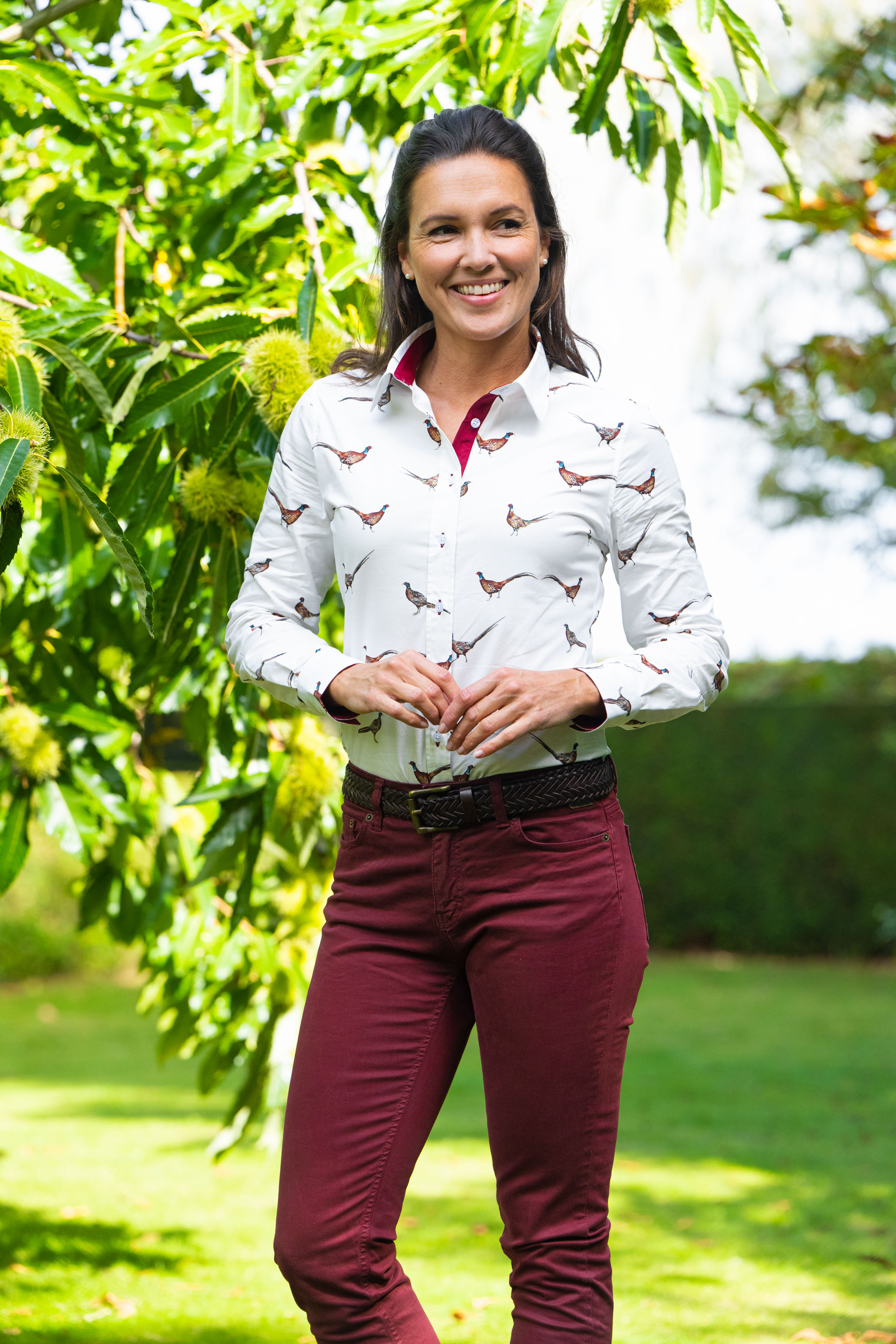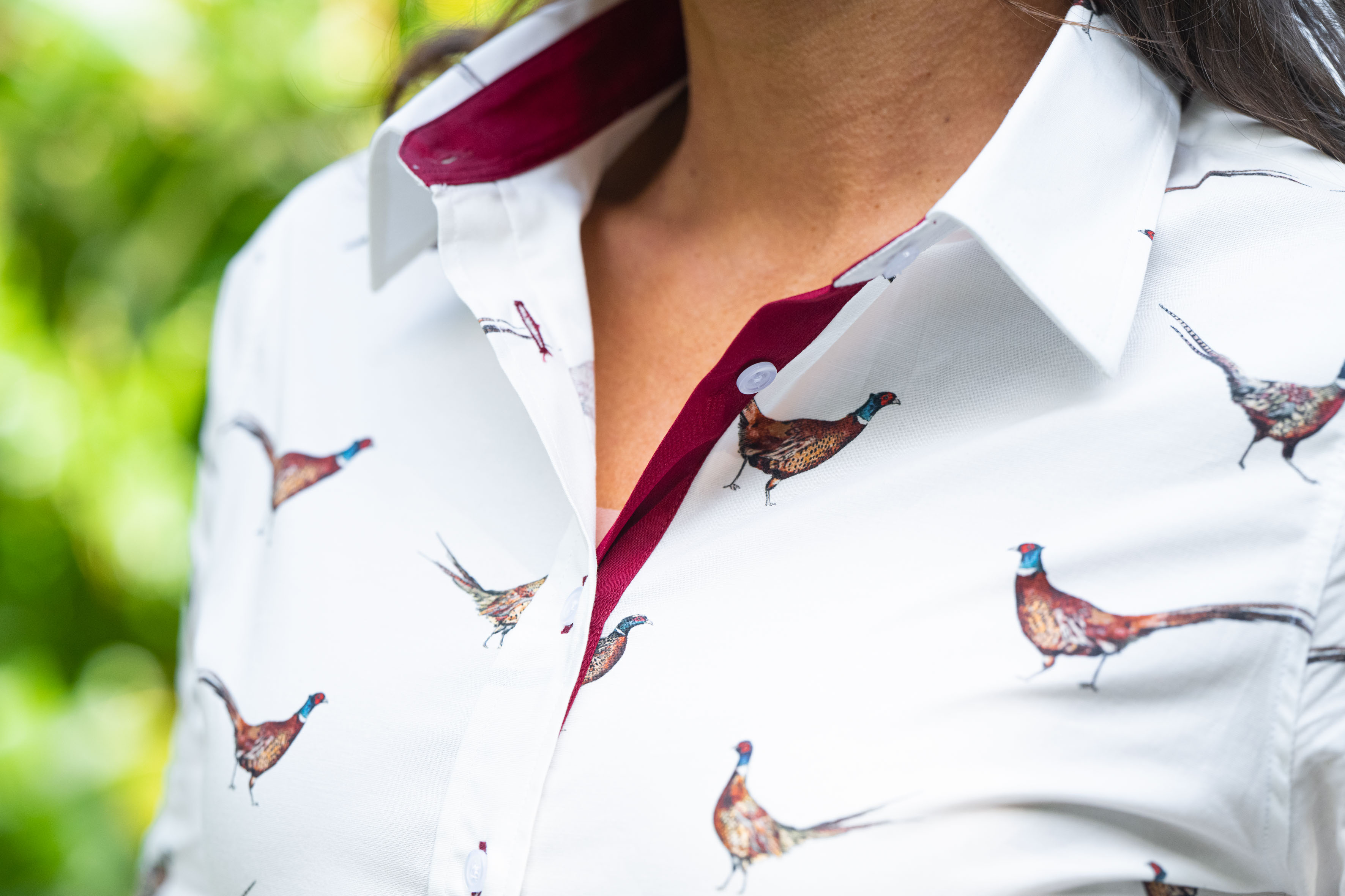 Crafted from a soft cotton with added stretch, the Laura pheasant shirt provides a statement piece to any wardrobe. Set against a crisp white background, this striking shirt has a beautiful pheasant print and contrasting burgundy collar colour. The shirt has been cut with a hem that looks great tucked in or left loose and looks great paired with smart trousers or skirt for a luxurious look. 97% cotton